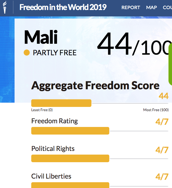 In chapter 3 of Emerging Africa, Radelet describes democracy as consisting of a protection of basic civil liberties, and human rights as well as being accountable to their citizens. A shift from the “Big Man” to the institution of power is another prominent point he makes concerning democracy. The growth of nongovernment watchdog groups which seek to monitor the government are also essential to the growth of democracy. Democracies have been ranked using Freedom House and polity iv factors. Mali has an aggregate score of 44 on the freedom scale which is relatively higher than many other countries in Africa. The country is described as being partly free but still struggles from political instability and violence. There is much work to be done in Mali but they are making strides in the right direction away from their imperial past. I also found that YALI is currently active in Mali and strides have been made to make medical information more available to the public.